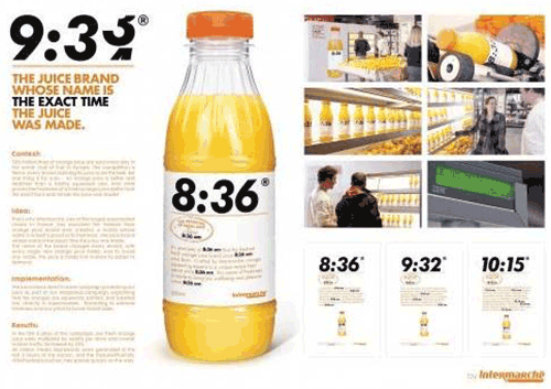這一點很多人不知道,能做到這一點的包裝設計或者設計師并不多見,會說話其實就是指消費者可以很簡單的從產品包裝上獲得他們想要了解的信息。下面這款橙汁的包裝設計,直接把生產時間作為主要元素印在包裝上,具體到幾時幾分,非常簡單粗暴的告訴消費者這瓶橙汁到底有多新鮮,這個設計也讓該品牌的橙汁銷量大增,這才是真正的牛創意。